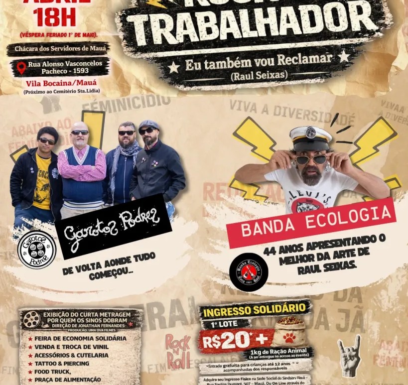 O Sindserv Mauá realiza, no próximo dia 30/04, a partir das 18h, o Festival Rock do Trabalhador, um evento especial em comemoração ao Dia do Trabalhador. A celebração acontecerá na Chácara do Servidor, em Mauá, reunindo música, cultura e solidariedade em uma noite dedicada à valorização da classe trabalhadora e da cena musical local. O festival será uma grande homenagem a duas bandas que marcaram a história … Continuar lendo Festival Rock do Trabalhador celebra o Dia do Trabalhador em Mauá com homenagem a bandas históricas do rock nacional