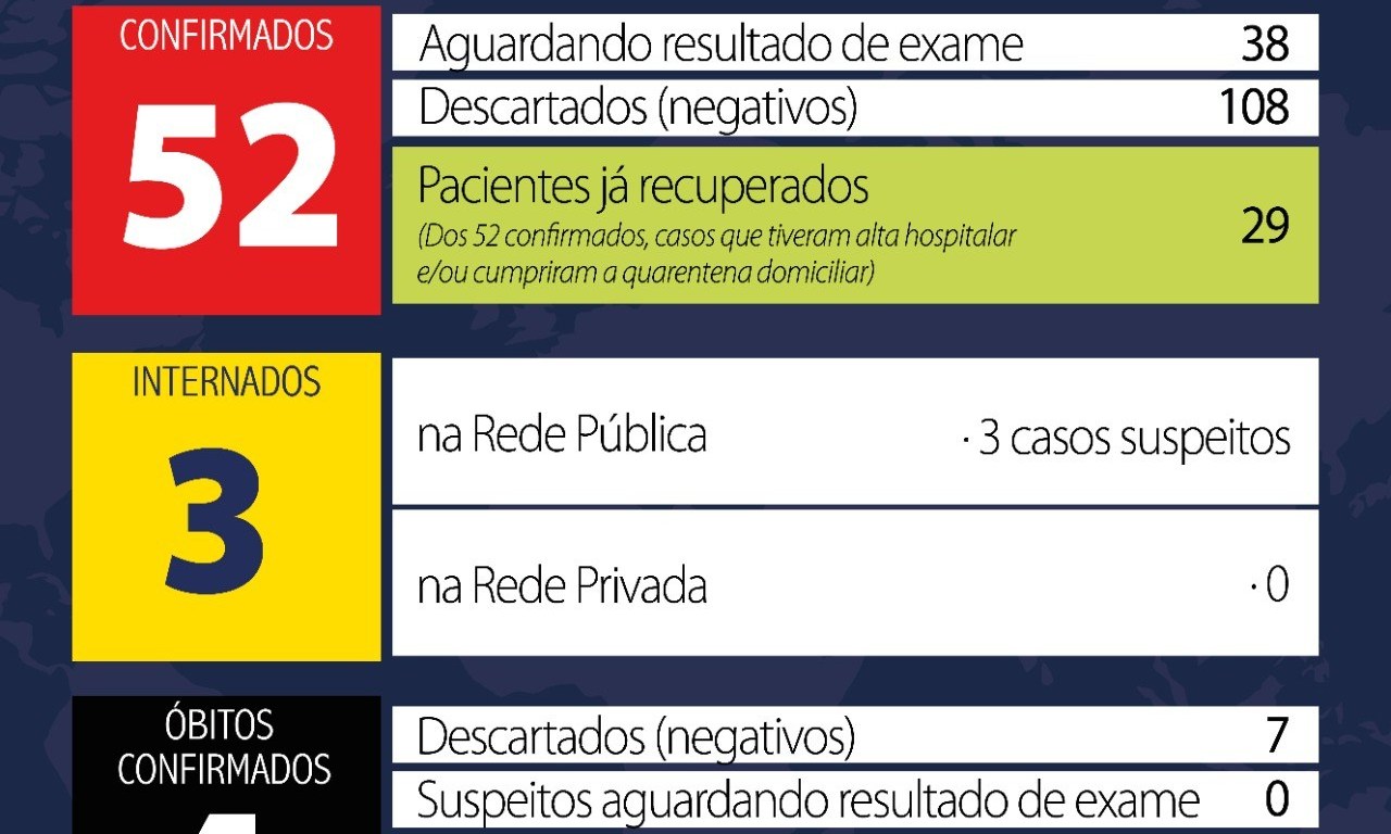 O município permanece com 4 óbitos confirmados por coronavírus entre moradores. Outros 7 óbitos foram descartados. Não há, nesta data, mortes por causa suspeita em análise.