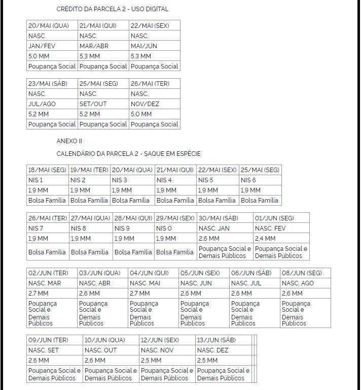 O Ministério da Cidadania divulga o calendário de pagamento da segunda parcela do auxílio emergencial. A medida foi publicada hoje no Diário Oficial da União. O calendário começa na segunda-feira para quase dois milhões de pessoas que recebem o Bolsa Família.