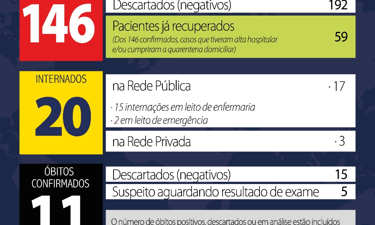 A cidade tem 192 casos descartados de COVID-19. Outras 40 suspeitas aguardam confirmação de exame de laboratório, incluindo 5 óbitos. 11 mortes por coronavírus foram confirmadas até o momento e 15 mortes com causa suspeita foram descartadas.
