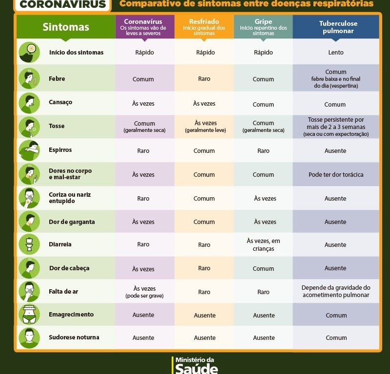 O Ministério da Saúde desenvolveu um material que pode auxiliar a população a identificar os sintomas de cada quadro clínico. Confira: