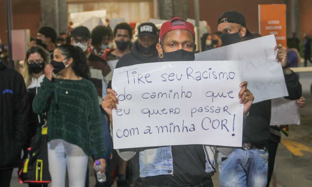 O ato iniciou na porta de saída do supermercado, no estacionamento, por volta das 19h45. Mesmo local onde aconteceu a violência racial. Enquanto estávamos lá, aguardando mais pessoas chegarem, os manifestantes gritavam palavras de ordem como “basta de racismo, jovem negro vivo”. Após concentrar mais pessoas, inclusive aguardávamos Alan chegar, decidimos seguir o ato uma vez que o shopping já havia sido fechado, pois era um dos trajetos pensados pra intervenção, na praça de alimentação, mas mudamos o plano quando vimos que, sair pelo shopping não seria possível.