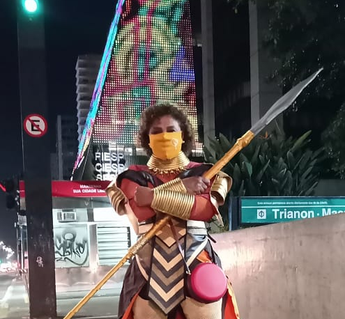 Fátima é uma super fã das histórias em quadrinhos e do mundo dos heróis do cinema. Para homenagear o ator ela se vestiu de Comandante Okoe e cumprimentou a distância os munícipes que passavam no calçadão da Praça 22 de Novembro em Mauá.