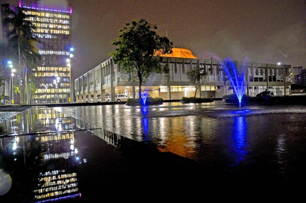 Prédio da Prefeitura e espelho d’água foram iluminados em apoio à campanha do Novembro Azul.