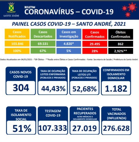 A Prefeitura de Santo André, por meio da Secretaria de Saúde, atualiza os números do novo coronavírus na cidade: