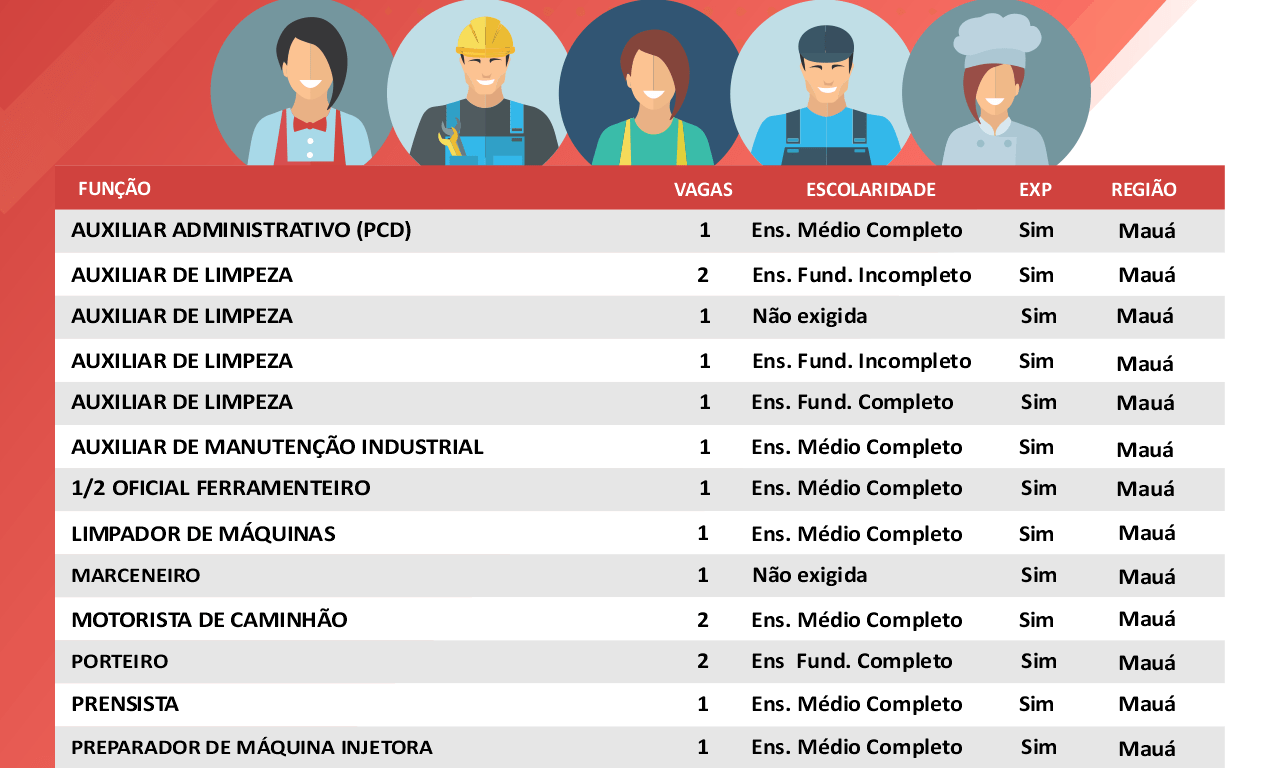 Para quem já trabalhou anteriormente e completou o ensino médio completo, tem vagas para prensista, porteiro, torneiro CNC, ferramenteiro, limpador de metais, auxiliar administrativo para PCD, auxiliar de manutenção industrial, assistente e auxiliar de vendas e preparador de máquinas injetoras. Todas as vagas são para a cidade de Mauá e exigem experiência.