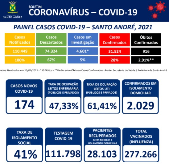 A Prefeitura de Santo André, por meio da Secretaria de Saúde, atualiza os números do novo coronavírus na cidade: