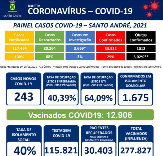 A Prefeitura de Santo André, por meio da Secretaria de Saúde, atualiza os números do novo coronavírus na cidade: