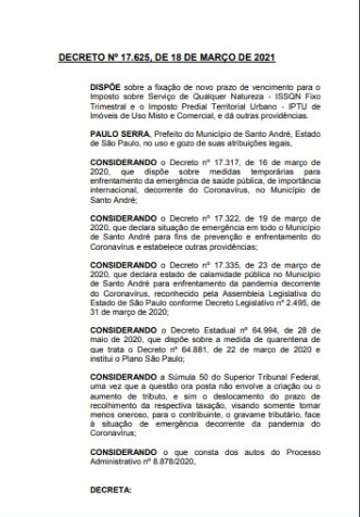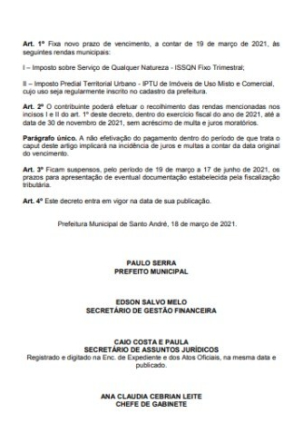 Santo André, 19 de março de 2021 – A Prefeitura de Santo André prorrogou até 30 de novembro de 2021 o pagamento do ISSQN (Imposto sobre Serviços de Qualquer Natureza) fixo e do IPTU (Imposto Predial e Territorial Urbano) de imóveis comerciais e imóveis de uso misto, sem juros ou multas.