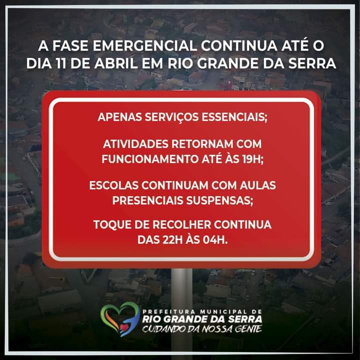 De acordo com o Decreto Municipal nº 2.795, de 1º de abril de 2021, fica prorrogada a Fase Emergencial de combate à Covid-19 em Rio Grande da Serra até o próximo dia 11 de abril.
