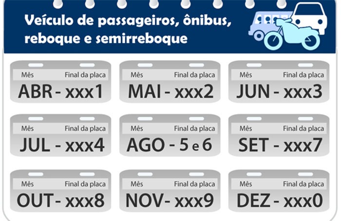 O calendário de vencimento do CRLV-e varia de acordo com o final da placa do veículo. Quem não realizou o licenciamento antecipado este ano, poderá fazer o pagamento até o último dia útil do mês de vencimento. O prazo vai de 1 de abril a 31 de dezembro – exceto para caminhões e tratores, que têm datas entre setembro e dezembro. Confira o cronograma anual na imagem abaixo: