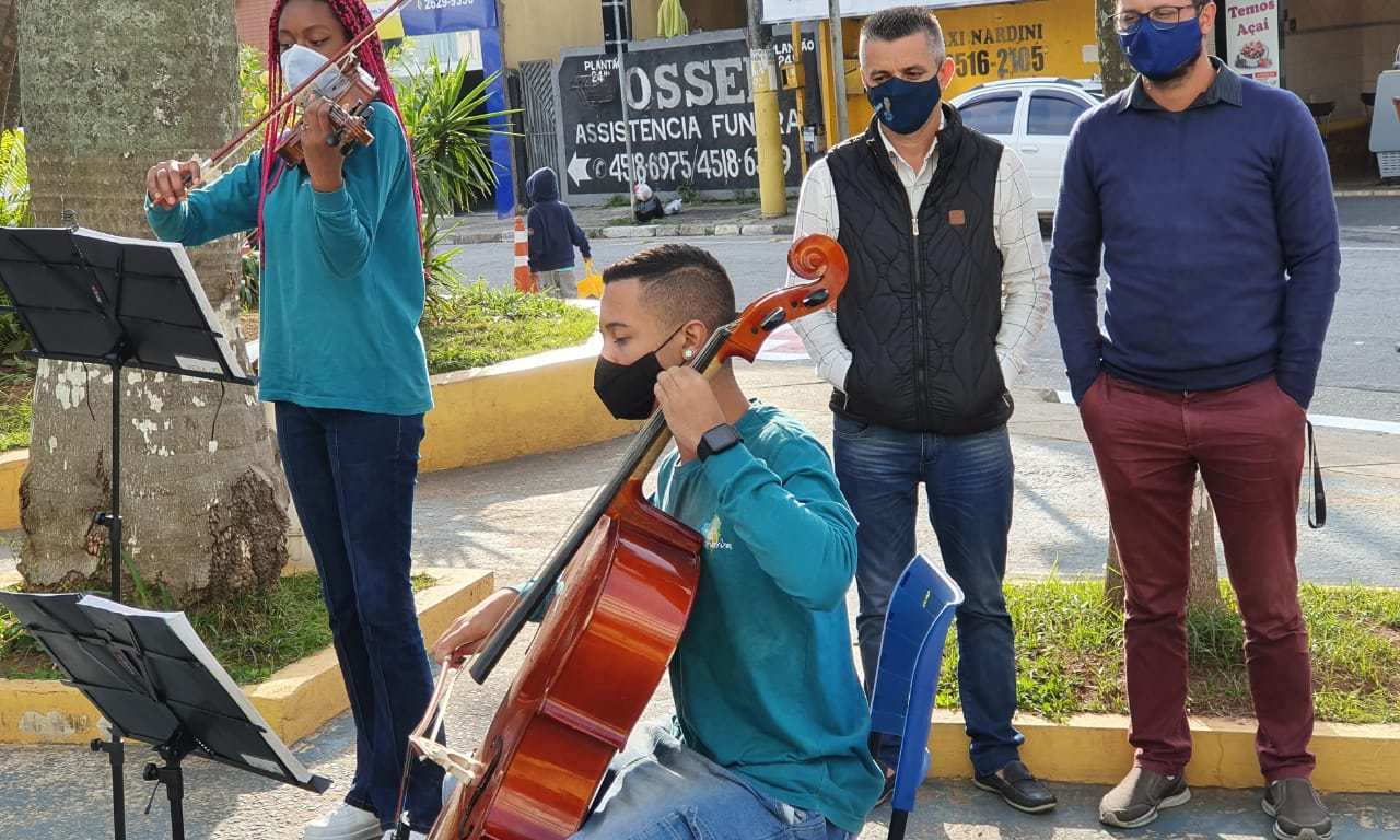 O vereador Mazinho (Patriotas), nesta sexta-feira (14), prestou homenagens aos profissionais da saúde junto aos integrantes do projeto Orquestra Locomotiva, em frente ao Hospital Nardini.
