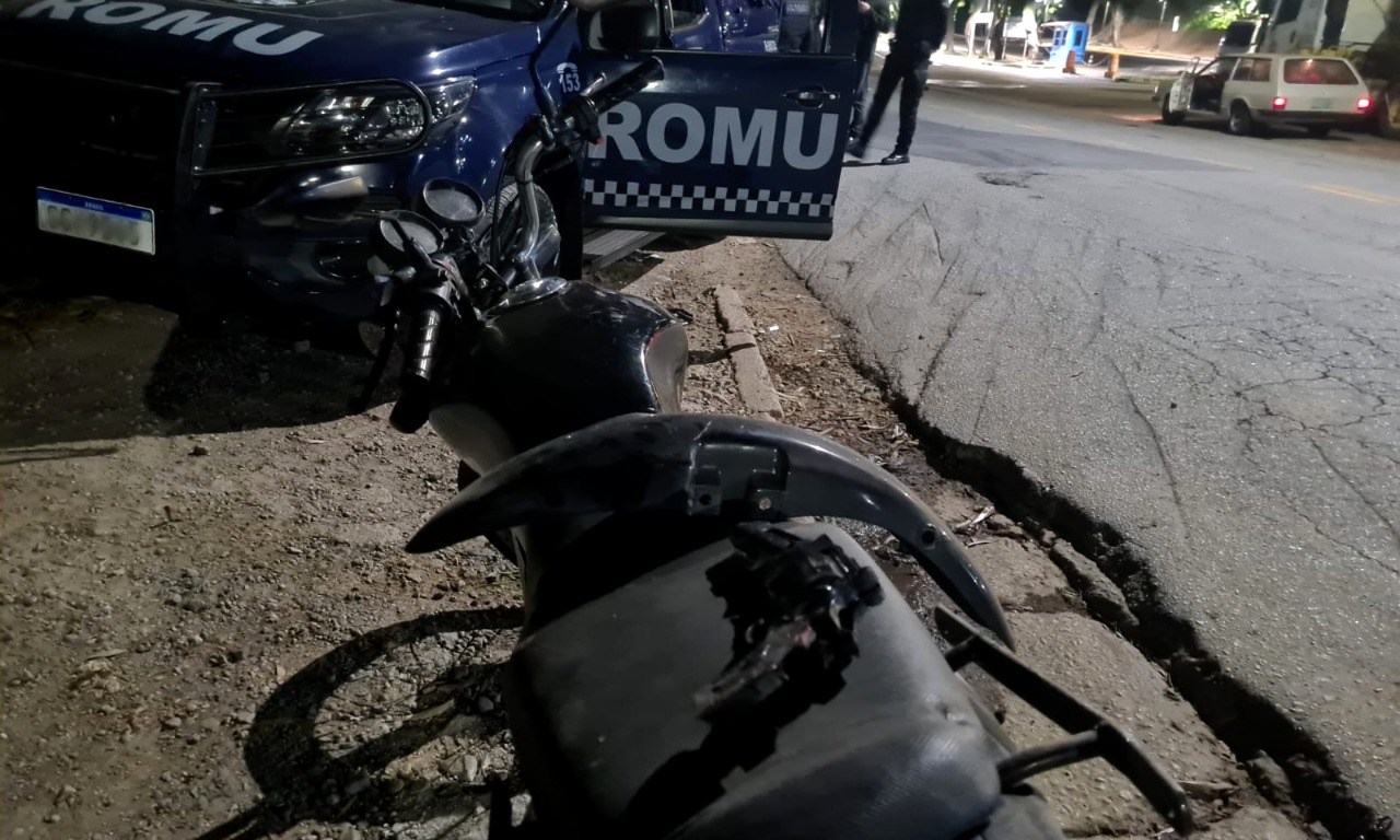 Iniciou-se uma perseguição que terminou na Rua Oscarito, no Jardim Sônia Maria, quando o condutor em fuga caiu da motocicleta e foi preso em flagrante. Ele portava uma réplica de arma de fogo.