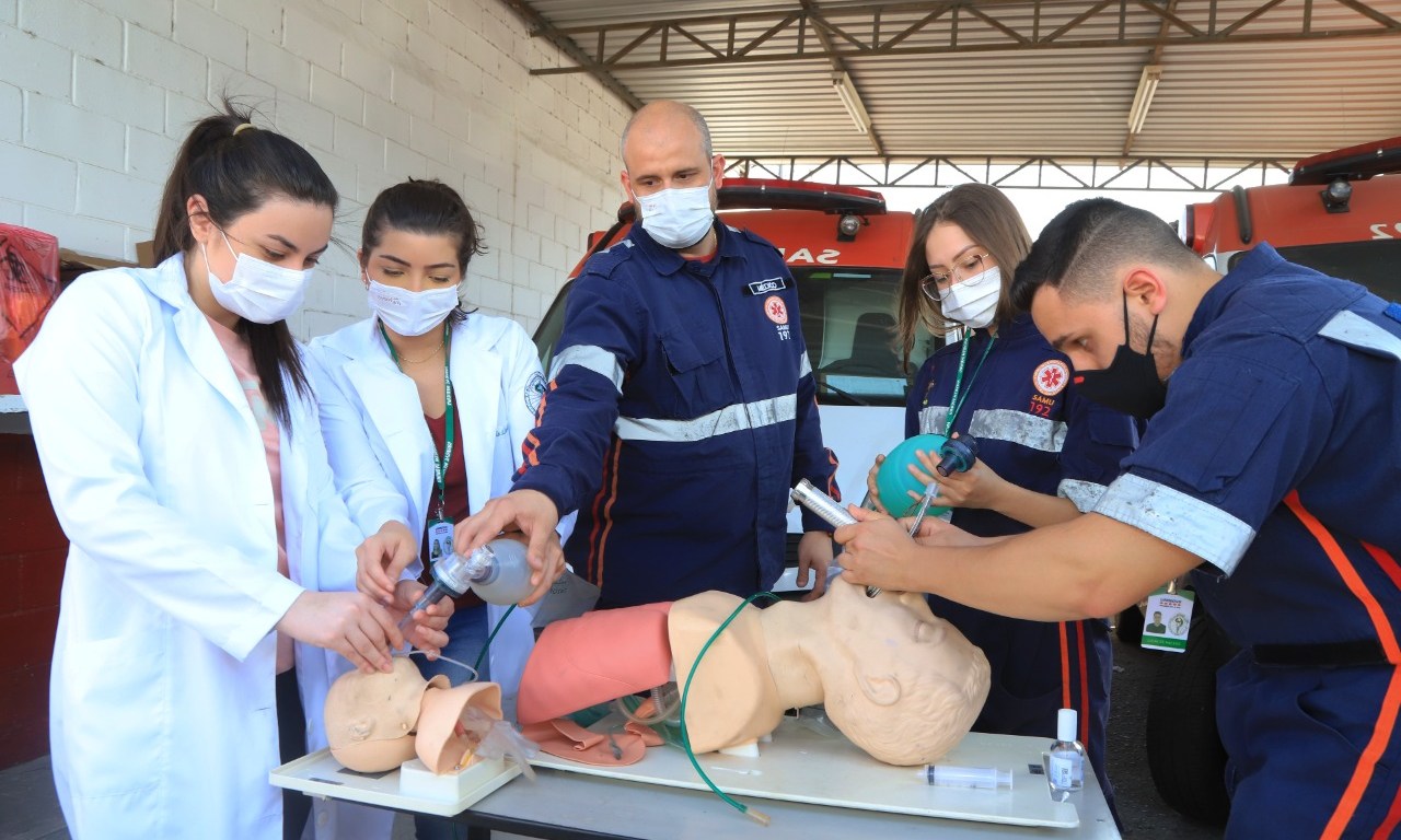 Na parte prática, com a utilização de boneco, são ensinadas técnicas de intubação, imobilização e transporte dos pacientes. Os estudantes também têm a oportunidade de acompanhar como é feito o atendimento nas ruas pelas equipes do Samu.