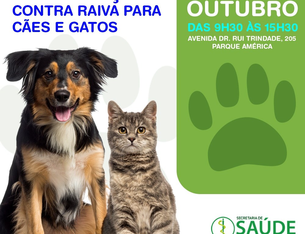 Nos próximos dias 18, 19 e 20 de outubro aproveite a oportunidade para imunizar seus cães e gatos contra a raiva. As vacinações acontecem das 9h30 às 15h30, na Avenida Dr Rui Trindade, 205, no Parque América.