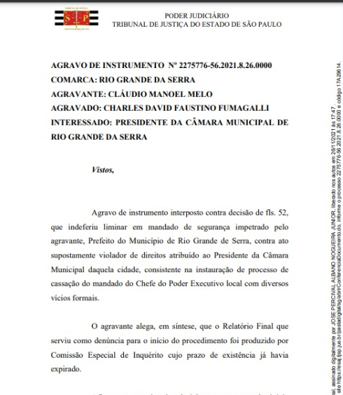 Uma liminar pedida por Claudinho foi indeferida pelo Tribunal de Justiça do Estado de São Paulo, mais uma vez ele teve seus movimentos jurídicos frustrados pela decisão da justiça. A estratégia do prefeito é de alguma maneira tentar barrar os trabalhos das duas comissões processantes, para que o processo de impeachment não seja consumado.