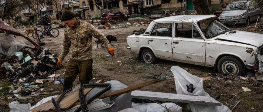 Moradores de Horenka, um subúrbio de Kiev, na segunda-feira perto de blocos de apartamentos que foram destruídos durante batalhas anteriores entre forças russas e ucranianas.