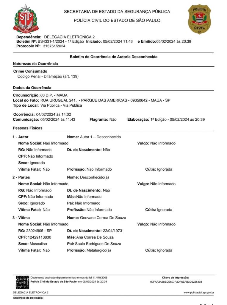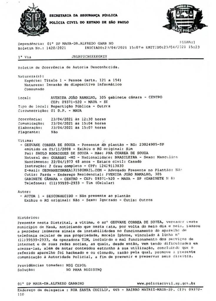 Vereador Geovane Corrêa: Primeiramente, quero esclarecer que este caso é fake e não procede, pois em meados de 2021 tive meu celular hackeado onde tiveram acesso a minhas fotos, meus contatos. E comecei a receber umas mensagens estranhas, cortei o papo de imediato, e em sequencia recebi uma ligação de um homem alegando ser pai de uma criança ( o qual estava tentando me extorquir) de imediato abri um Boletim de Ocorrência pela tentativa de Golpe. Ate porque se eu fosse pai e isso fosse verídico eu teria ido a delegacia para proteger minha filha (o que não aconteceu). Acreditei que estava resolvida essa questão mas o golpista enviou imagens a varios contatos meus do celular que ele havia clonado. Porém após esta denúncia infundada acabou retornando novamente esse ano.
