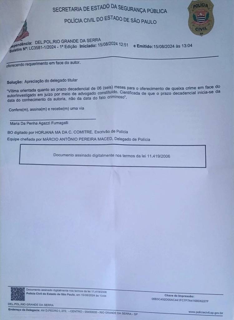 A prefeita de Rio Grande da Serra e candidata à reeleição Penha Fumagalli (PSD) registrou, nesta quinta-feira (15), Boletim de Ocorrência (BO) contra o também candidato Akira Auriani (PSB).