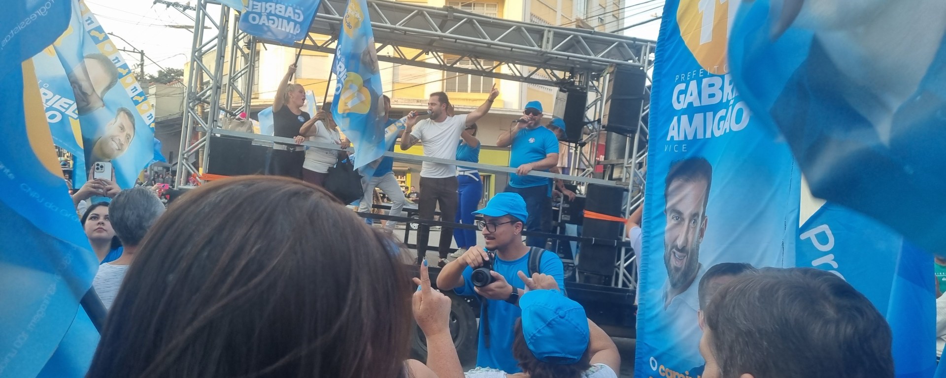 Após comício na manhã de sábado (17) em Ouro Fino, Gabriel Roncon e Amigão D’Orto fizeram na parte da tarde uma caminhada com apoiadores no centro de Ribeirão Pires, cumprimentando comerciantes e as pessoas que frequentavam a Vila do Doce.
