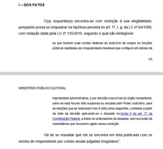De acordo com o documento apresentado pelo MPE, as contas de Jacomussi foram rejeitadas pelo Tribunal de Contas do Estado de São Paulo (TCE-SP) em função de irregularidades graves. Essas falhas, segundo o Ministério Público, indicam que o candidato teria agido com dolo, ou seja, com a intenção de lesar os cofres públicos ou desrespeitar normas legais, o que inviabilizaria sua candidatura sob a atual Lei da Ficha Limpa (Lei Complementar nº 135/2010).