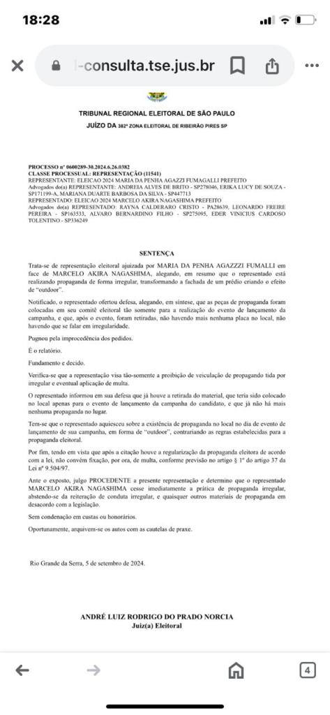 O juiz eleitoral André Luiz Rodrigo do Prado julgou procedente mais uma representação feita pela campanha da prefeita de Rio Grande da Serra e candidata à reeleição Penha Fumagalli (PSD), desta vez, contra a campanha do oposicionista Marcelo Akira Nagashima (Podemos).