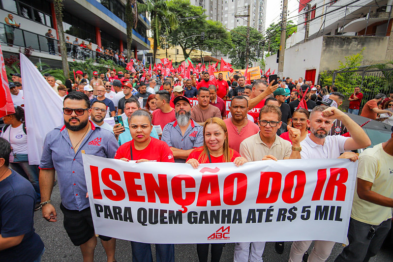 Cerca de 5 mil manifestantes participaram da caminhada, que teve início na sede do Sindicato dos Metalúrgicos do ABC e seguiu até a Praça da Matriz, em São Bernardo, realizada na manhã desta sexta-feira (14). A mobilização em defesa das pautas da classe trabalhadora teve como principais pontos a isenção do Imposto de Renda (IR) para quem ganha até R$ 5 mil; isenção do IR sobre a Participação nos Lucros e Resultados (PLR); redução da jornada de trabalho sem redução de salário; fim da escala 6×1; e redução da taxa de juros.
