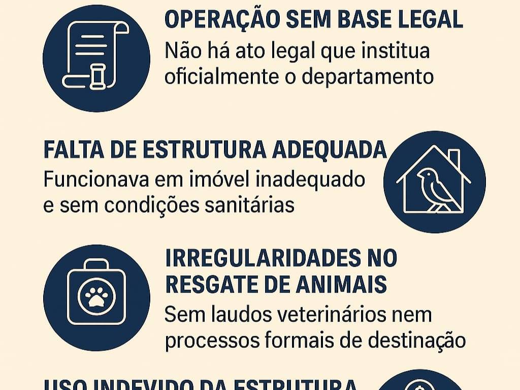 Segundo denúncias recebidas pelo Ministério Público, o DPFAUNA funcionava em um imóvel residencial, desprovido de licenciamento técnico ou condições sanitárias para a custódia de animais silvestres. Não foram localizados processos administrativos formais para os resgates, laudos veterinários, nem registro sobre o destino ou estado de saúde dos animais recolhidos. Ainda de acordo com as acusações, não há nenhum ato legal que institua oficialmente o departamento, o que indicaria sua operação à margem da legalidade administrativa.
