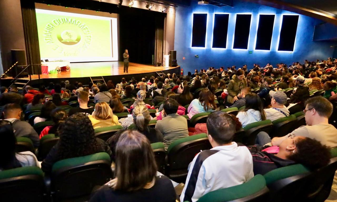 Em um Teatro Municipal completamente lotado em dois períodos, o especialista abordou o tema “Como pensar práticas antirracistas em sala de aula?”, destacando a importância da empatia e da reflexão crítica para combater o racismo na educação.