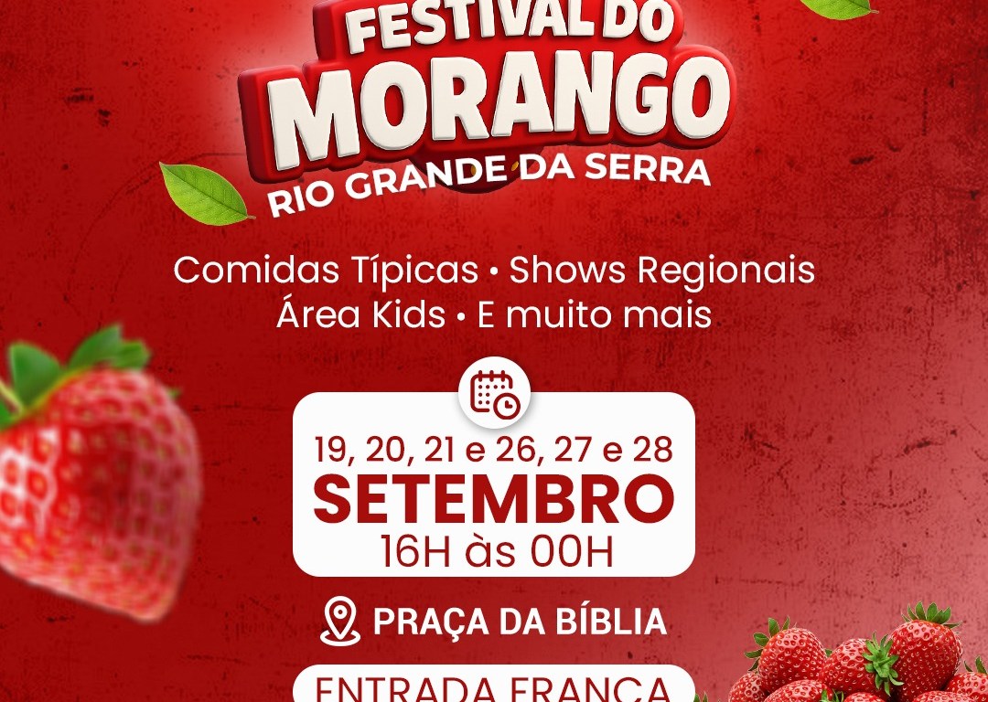 A cidade de Rio Grande da Serra vai ganhar um novo sabor em setembro! Vem aí o 1º Festival do Morango, um evento inédito que promete encantar moradores e visitantes com uma programação especial para toda a família.