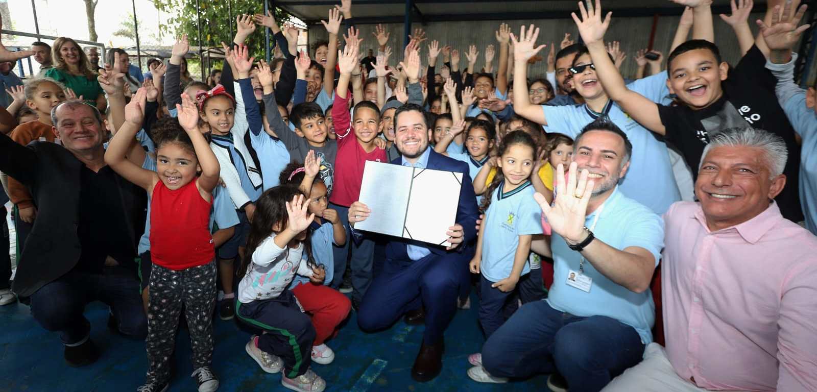 Ovacionado pelas crianças, o prefeito Gilvan Ferreira assinou a ordem de serviço que dá início às intervenções, juntamente dos secretários Pedrinho Botaro (Educação) e José Antônio Ferreira (Manutenção e Serviços Urbanos).