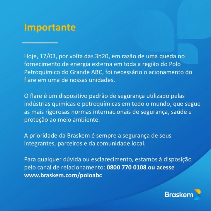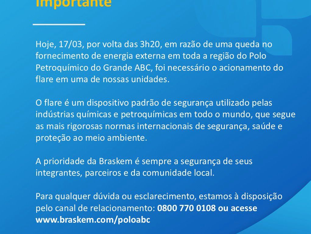 GeralQueda de energia na região obrigou o acionamento de flare da Braskem em Mauá Empresa publicou comunicado oficial Compartilhe isso: Compartilhar no X(abre em nova janela) 18+ Compartilhar no Facebook(abre em nova janela) Facebook Curtir Carregando... Relacionado