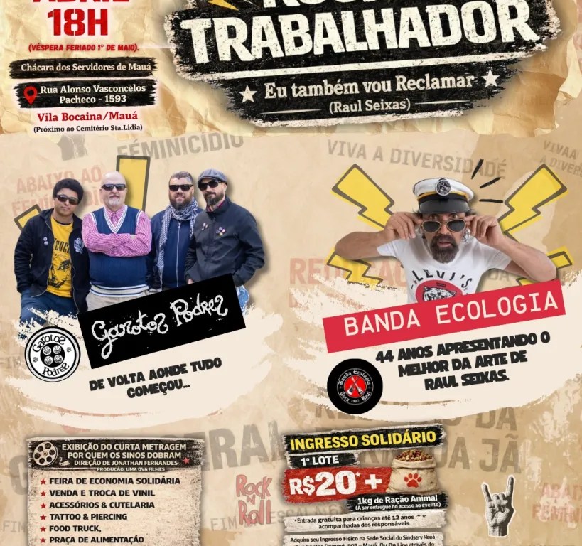 O Sindserv Mauá realiza, no próximo dia 30/04, a partir das 18h, o Festival Rock do Trabalhador, um evento especial em comemoração ao Dia do Trabalhador. A celebração acontecerá na Chácara do Servidor, em Mauá, reunindo música, cultura e solidariedade em uma noite dedicada à valorização da classe trabalhadora e da cena musical local.