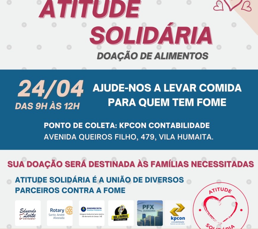 Campanha intitulada como Atitude Solidária terá força máxima neste sábado dia 24 de abril Iniciamos hoje uma campanha de arrecadação de alimentos para ajudar aqueles que foram e estão sendo muito afetados pela pandemia e passando necessidades.“Atitude Solidária” é a união de diversos parceiros contra a fome, são eles: mandato do vereador Eduardo Leite, Rotary Club Alvorada, PFX Elevadores, SindReceita, Hillarius Comedy Bar e Kpcon.Ajude-nos … Continuar lendo Campanha de arrecadação de alimentos em Santo André