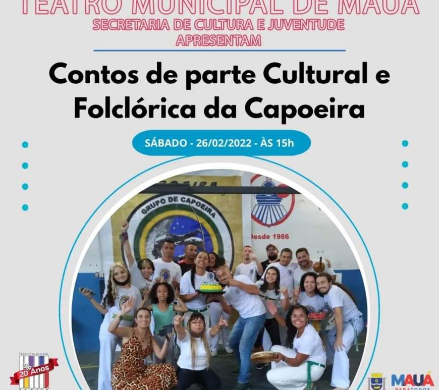 CAPOEIRA 26/02 | 15h | Contos de parte Cultural e Folclórica da Capoeira | Grupo Meia Lua de Compasso | 25 minutos Capoeira com Faca e Navalha, Capoeira com pés e mãos amarradas, Samango bailado. Ambos inventados pelos escravos para fugirem da polícia e do Capataz Teatro Municipal de Mauá LIVRE l GRATUITO Continuar lendo Contos de parte Cultural e Folclórica da Capoeira | Grupo Meia Lua de Compasso