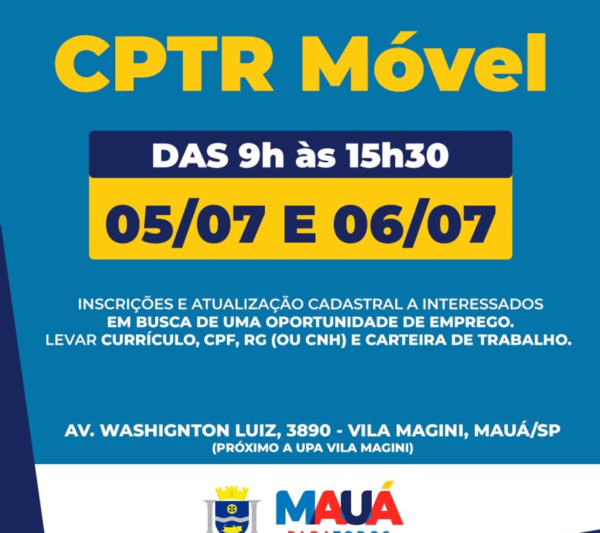 Atendimento será próximo à UPA, das 9h às 15h30 Para ajudar no cadastro de pessoas sem emprego, o CPTR Móvel deslocará o atendimento móvel para a Vila Magini na próxima semana. O intuito é ajudar quem transita pela região e tem dificuldade em comparecer pessoalmente ao endereço fixo do órgão, no Bairro da Matriz. Nos dias 5 e 6 de julho (próximas segunda e terça-feira), … Continuar lendo CPTR Móvel retorna à Vila Magini em Mauá
