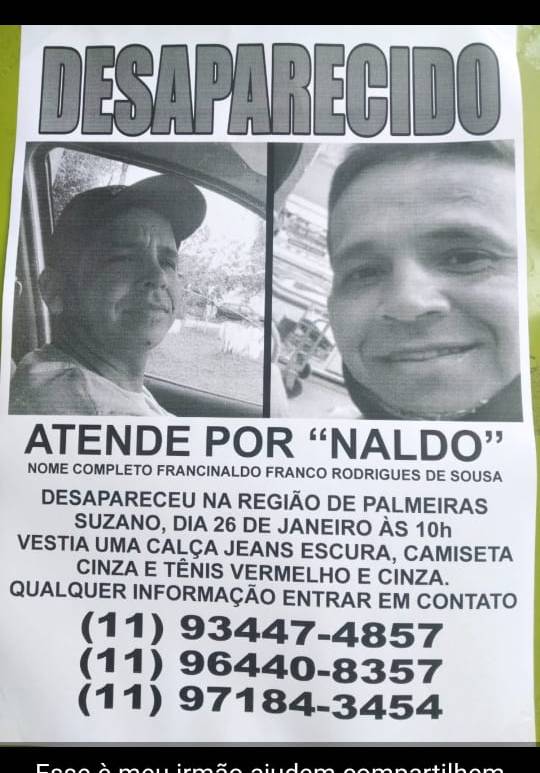 Atende pelo nome de “Naldo”Nome completo : Francisnaldo Franco Rodrigues de Sousa°Desepareceu na região de Palmeiras em Suzano, dia 26 de Janeiro às 10hr. Vestia uma calça jeans escura, camiseta cinza e tênis vermelho e cinza.Qualquer informação entrar em contato pelos telefones: •(11)93447-4857 •(11)96440-8357•(11)97184-3454 Continuar lendo Desaparecido