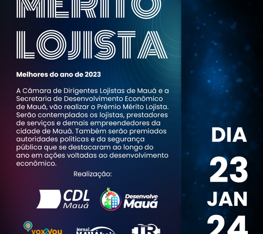 Um evento fundamental está prestes a acontecer na cidade de Mauá! No próximo dia 23 de janeiro, o Teatro Municipal será palco da entrega do aguardado Prêmio Mérito Lojista, uma iniciativa promovida pela CDL (Câmara dos Dirigentes Lojistas) em colaboração com diversos veículos de comunicação locais, como jornais, sites, páginas e outras mídias. A cerimônia, conhecida como “Os Melhores do Ano”, busca destacar e homenagear … Continuar lendo Destaque e Reconhecimento: Prêmio Mérito Lojista celebra “Os Melhores do Ano” em Mauá