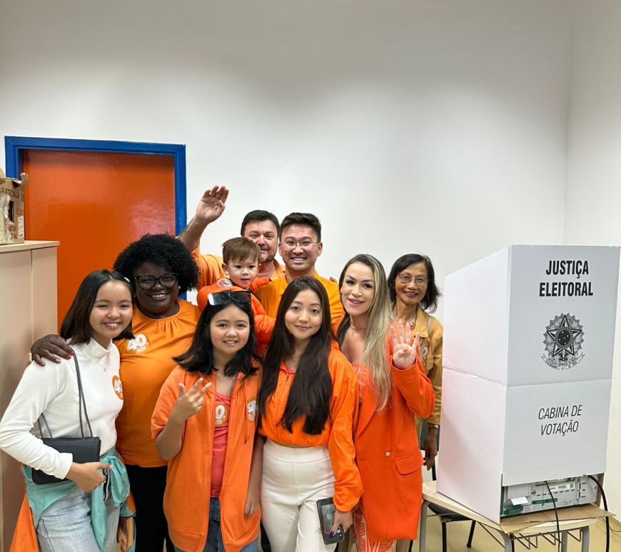 Akira Auriani vota ao lado de sua vice, Vilma Marcelino, e família em Rio Grande da Serra