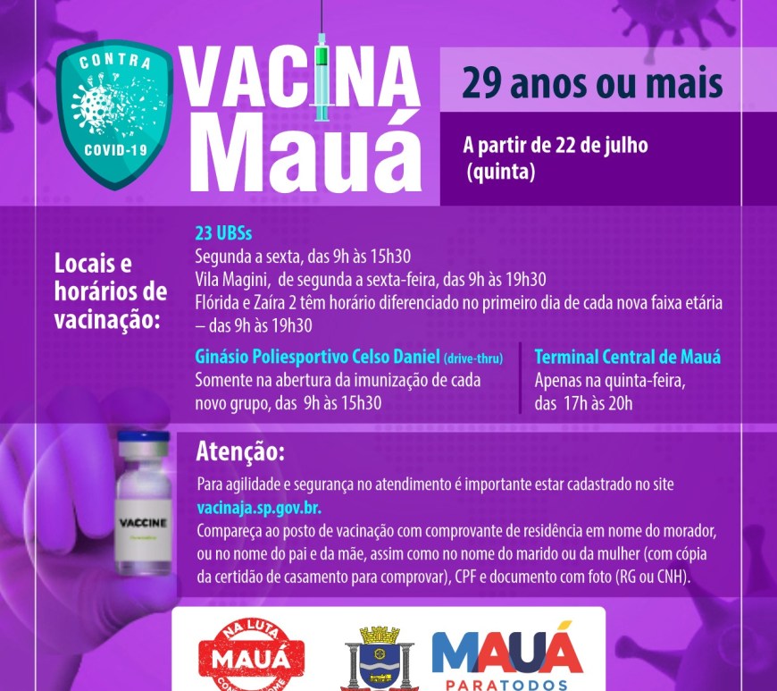 Imunização a esse público será a partir desta quinta-feira (22/07) em 25 postos A partir desta quinta-feira (22/07), Mauá dá mais um passo à frente na vacinação contra a Covid. Quem mora na cidade e tem 29 anos ou mais poderá se vacinar em 25 postos que a Prefeitura de Mauá colocará à disposição dessa população, estimada em mais de 12 mil pessoas. Além das … Continuar lendo Mauá anuncia vacinação contra a Covid a quem tem 29 anos ou mais