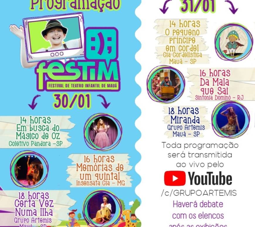 O FESTIM, 1° Festival de Teatro Infantil de Mauá, que inicialmente seria presencial, por conta da pandemia será realizado online, via transmissão dos espetaculos em 30 e 31 de janeiro de 2021 na cidade de Mauá – SP, Brasil, com o intuito de reunir grupos que desenvolvem a temática cênica para crianças, valorizando o trabalho teatral produzido em Mauá e no território brasileiro, promovendo intercâmbio … Continuar lendo O Festim será online em Mauá