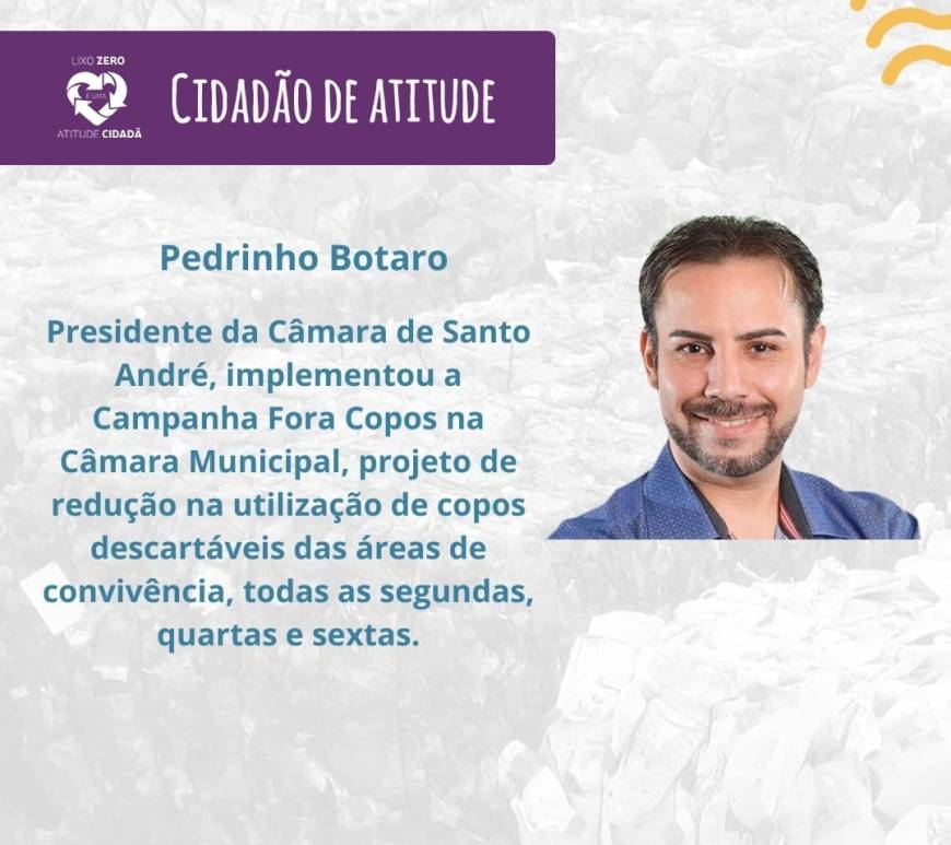 O vereador Pedrinho Botaro, Presidente da Câmara de Santo André, recebeu do Instituto Lixo Zero Brasil, o título Atitude Cidadã pela campanha “Fora Copo” realizada no legislativo andreense. Botaro além de dar a orientação ao consumo consciente de material descartável, reduziu a quantidade comprada, gerando economias aos cofres públicos. Em tempo, Pedrinho Botaro logo no primeiro ano de gestão como Presidente, implantou o projeto “Câmara … Continuar lendo Pedrinho Botaro recebe título de Atitude Cidadã em Ação de Sustentabilidade na Câmara de Santo André