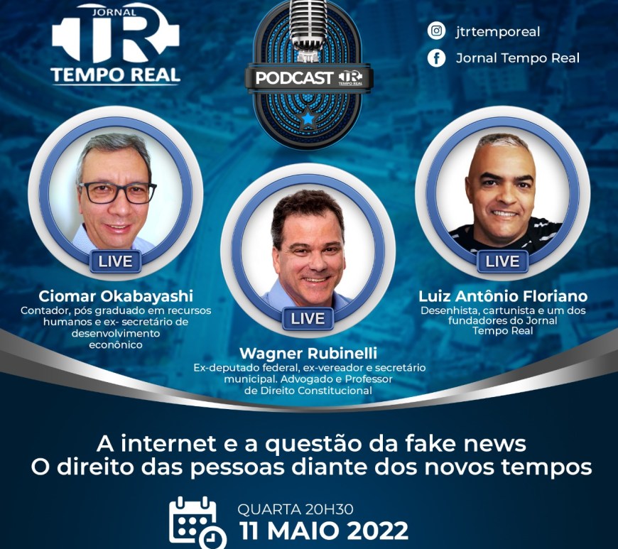 O primeiro Podcast está disponível no canal do jornal no Youtube. Exibido no canal parceiro Pix Live Podcast apresentado por Luiz Floriano e Ciomar Okobayashi, teve a participação de Wanderlei Zeca engenheiro elétrico. Próximo convidado será o ex-deputado federal, ex-vereador e secretário municipal, advogado e professor Wagner Rubinelli. Canal: https://tinyurl.com/temporealpodcast Veja o vídeo: Continuar lendo Podcast Tempo Real debate novas idéias e novos conceitos nesta quarta-feira ás 20:30